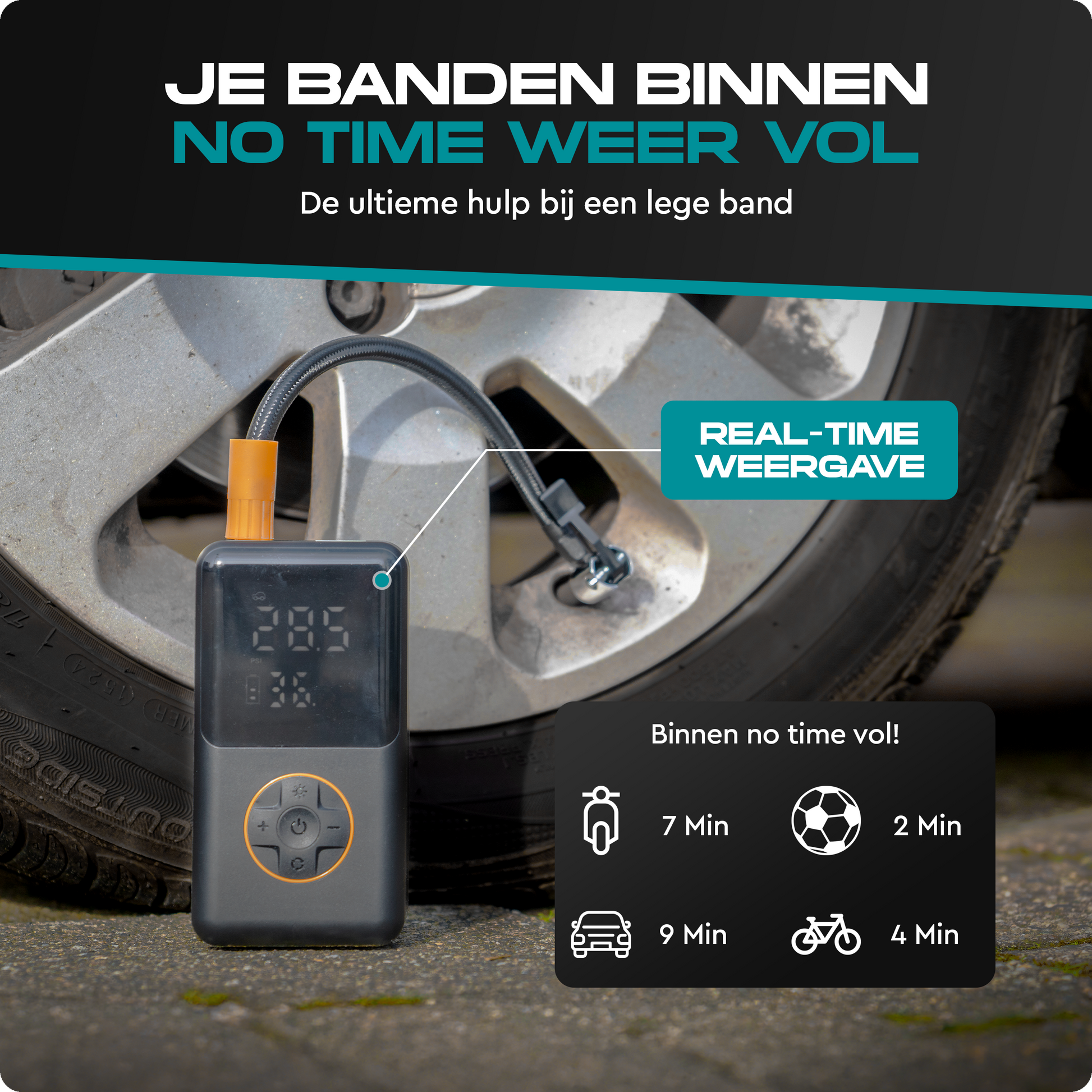 Hoge luchtstroom: De luchtstroom van 22 liter per minuut zorgt ervoor dat u in slechts 9 minuten een standaard autoband (195/55R15) volledig kunt oppompen.