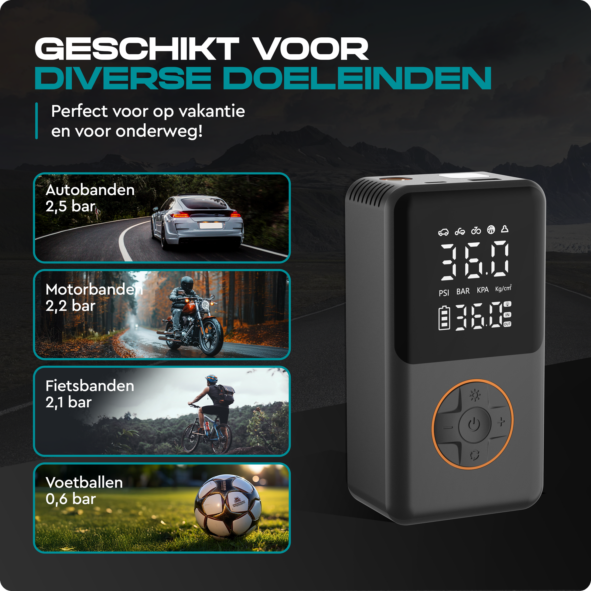 De Carsweep® Bandenpomp is niet alleen geschikt voor autobanden, maar kan ook motorbanden, fietsbanden en sportballen met gemak oppompen. Dankzij de meegeleverde accessoires en verschillende luchtmondstukken is deze pomp geschikt voor een breed scala aan toepassingen. De USB-oplaadkabel maakt het eenvoudig om de pomp thuis of onderweg op te laden, zodat u altijd voorbereid bent.