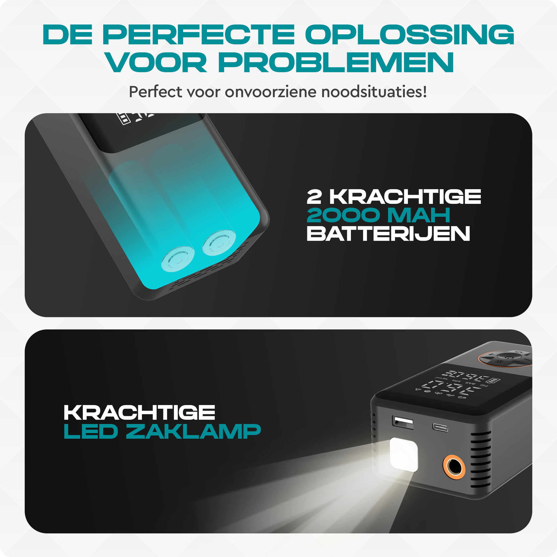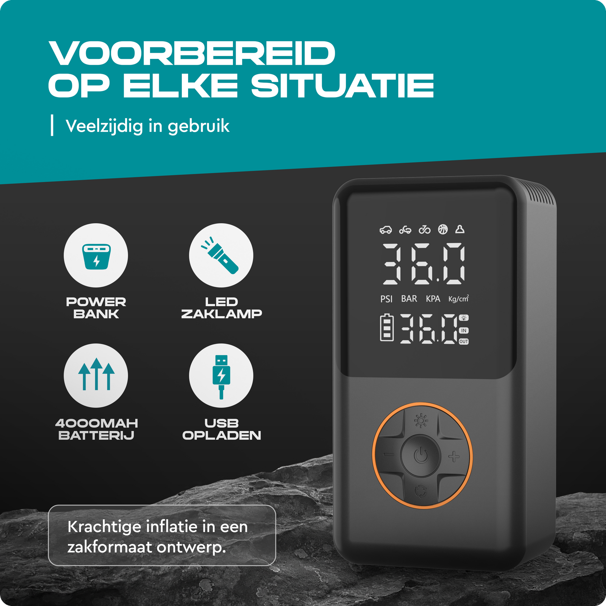 Duurzame batterij: Uitgerust met twee krachtige 2000 mAh batterijen, biedt deze pomp voldoende vermogen om meerdere banden op te pompen voordat hij opnieuw moet worden opgeladen.